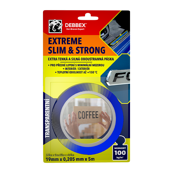 Dwustronna taśma z mocną warstwą kleju akrylowego i nośnikiem z tworzywa sztucznego (PET). Charakteryzuje się wyjątkową cienkością i wysoką odpornością na temperaturę. Doskonale przylega do szerokiego spektrum podłoży. Posiada dużą zaletę w natychmiastowej pełnej przyczepności, co przyspiesza montaż i uruchomienie klejonego elementu.