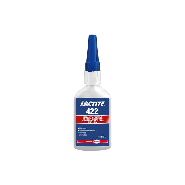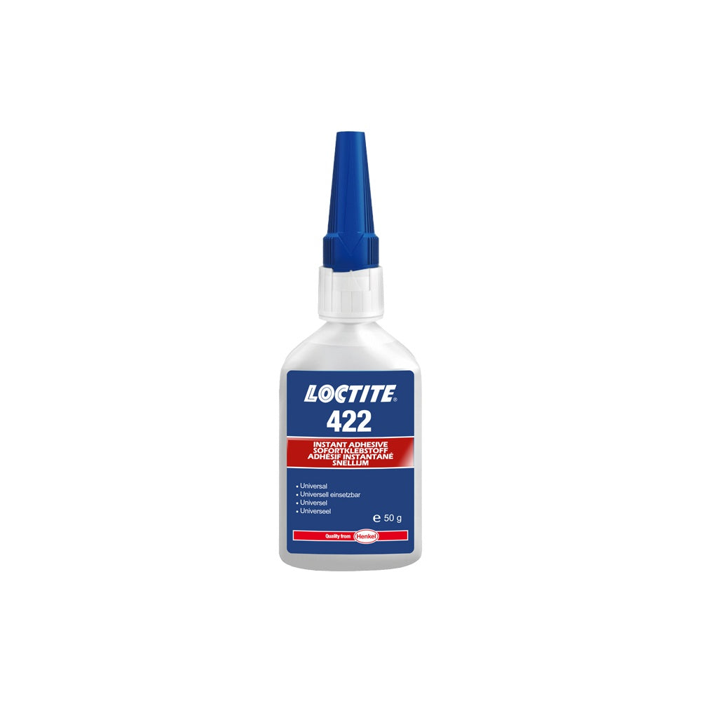 Loctite 422 to szybkoschnący klej cyjanoakrylowy przeznaczony do codziennych zastosowań, umożliwia szybkie łączenie szerokiej gamy materiałów, w tym metali, tworzyw sztucznych i elastomerów. Działa w cienkich warstwach w ciągu kilku sekund. Odporność na benzynę i oleje silnikowe zapewnia wysoką trwałość połączeń.